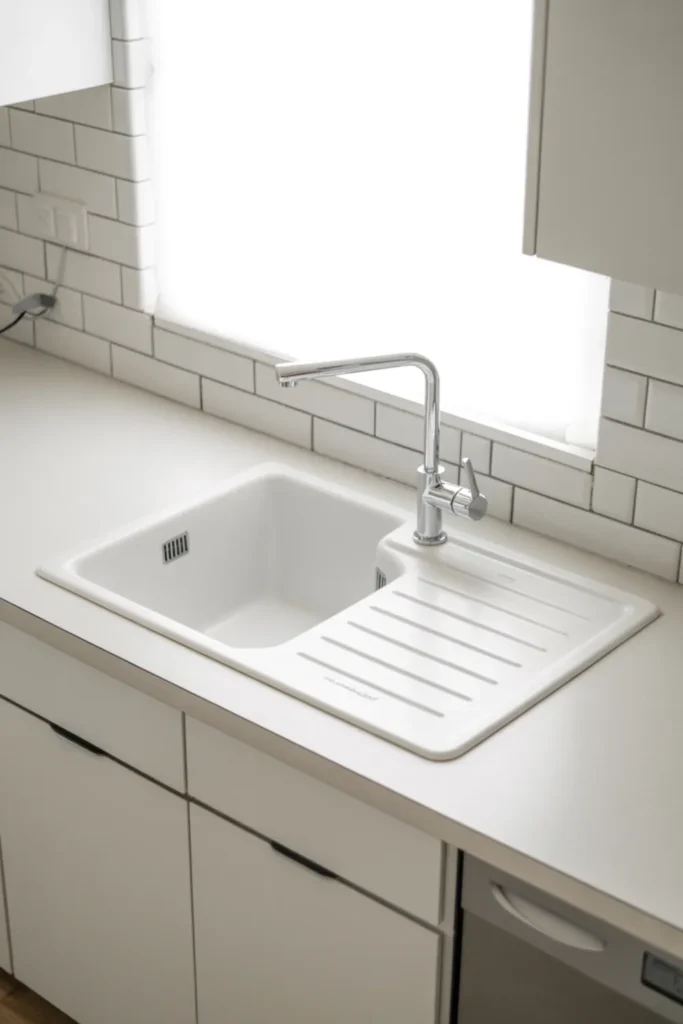 A white single bowl kitchen sink keeps your counter area looking calm, which matters in a small kitchen. One big basin handles pans better than a split sink, and the simple shape looks sleek with white kitchen cabinets.