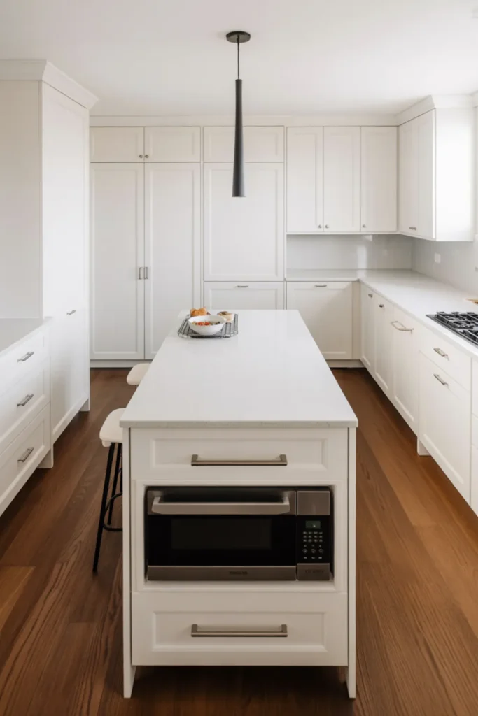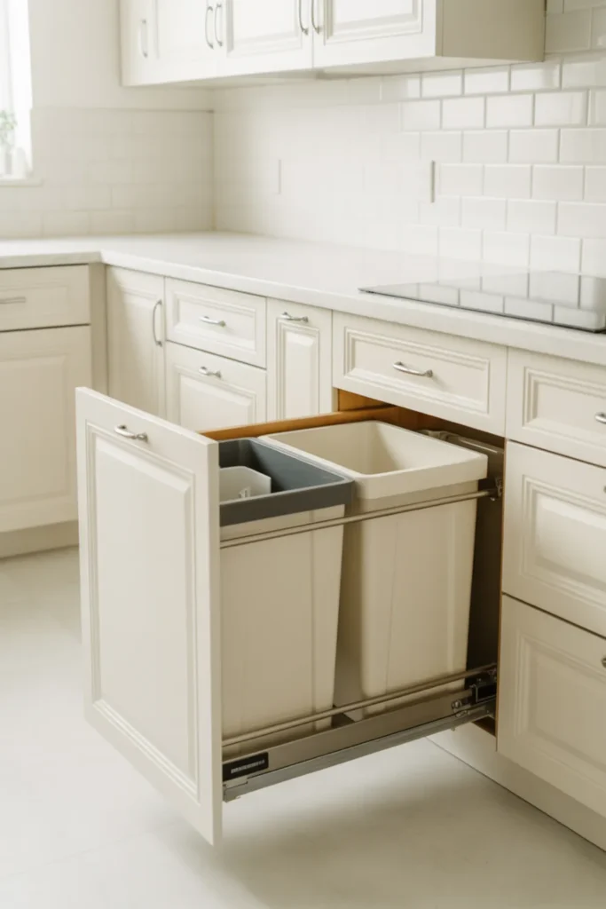 Nothing ruins white kitchen decor faster than a trash can in the corner. Add a hidden pull-out and your counters instantly look cleaner, especially in a small white kitchen.