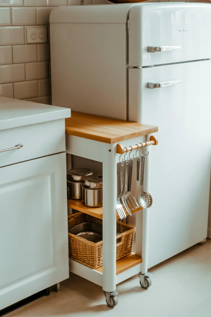 A rolling cart is a smart move when you need flexibility. Slide a narrow micro island into your small kitchen for prep, then tuck it away when you’re done.