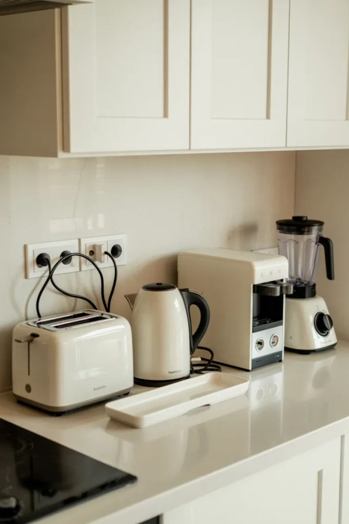 Cords can ruin the vibe fast, so use a hidden outlet strip or cord clips behind the appliances. Keep the rest of the counter clear so the white countertops still feel spacious.