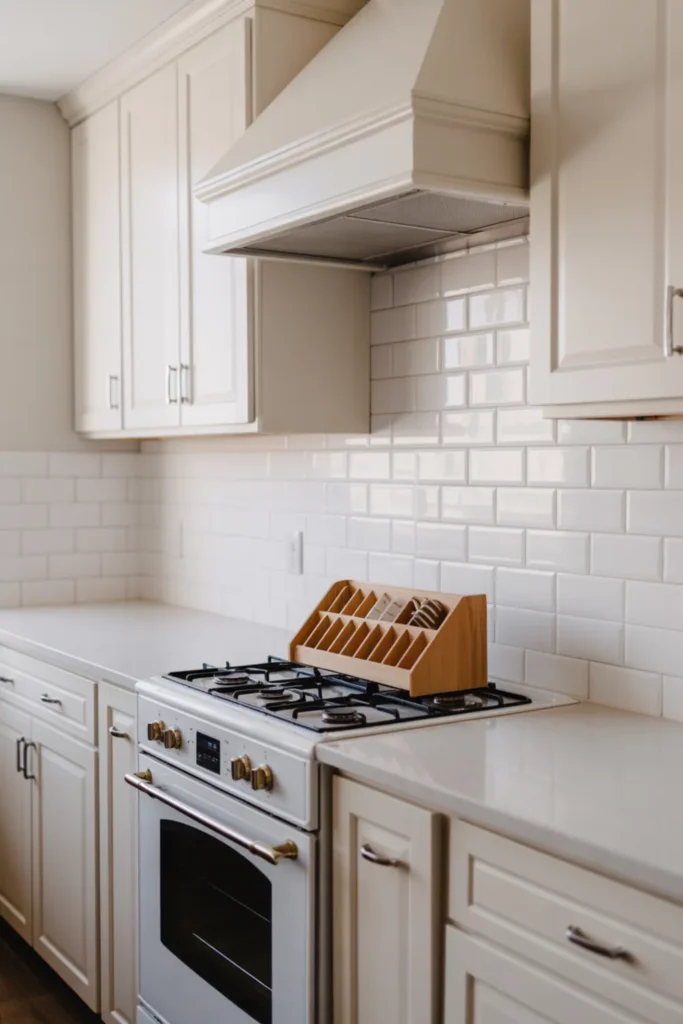 Add a slim pull-out spice rack next to the range for easy access without cluttering drawers. A bright white kitchen backsplash behind the stove keeps the cooking area feeling clean and open.