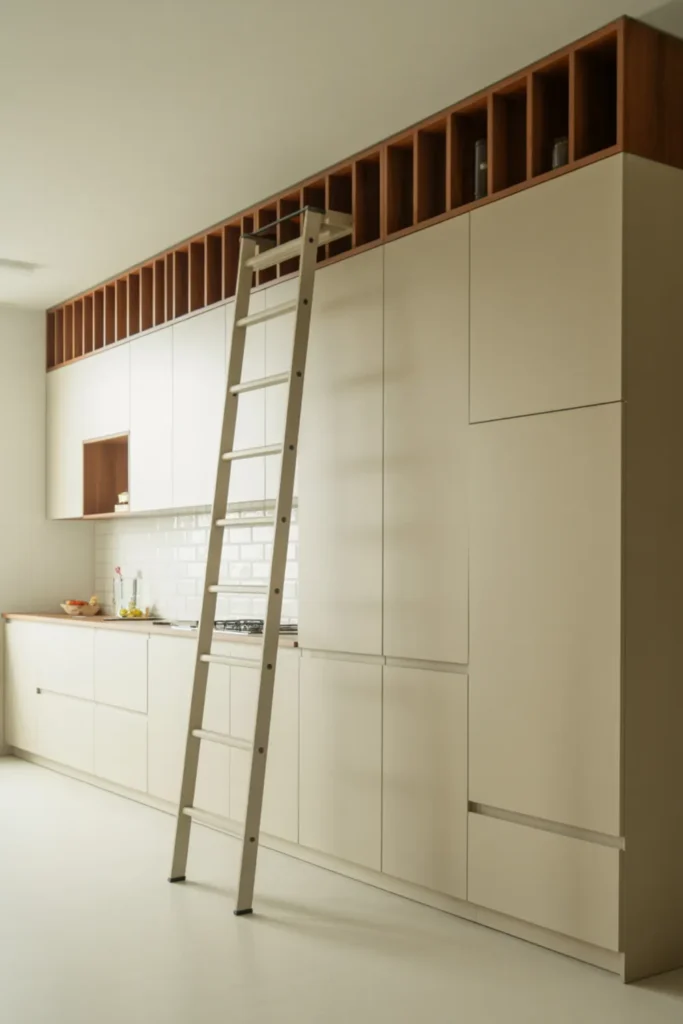 Use one neat step stool that tucks beside the fridge or inside a pantry. For extra polish, add under-cabinet lighting to keep the cooking area bright.