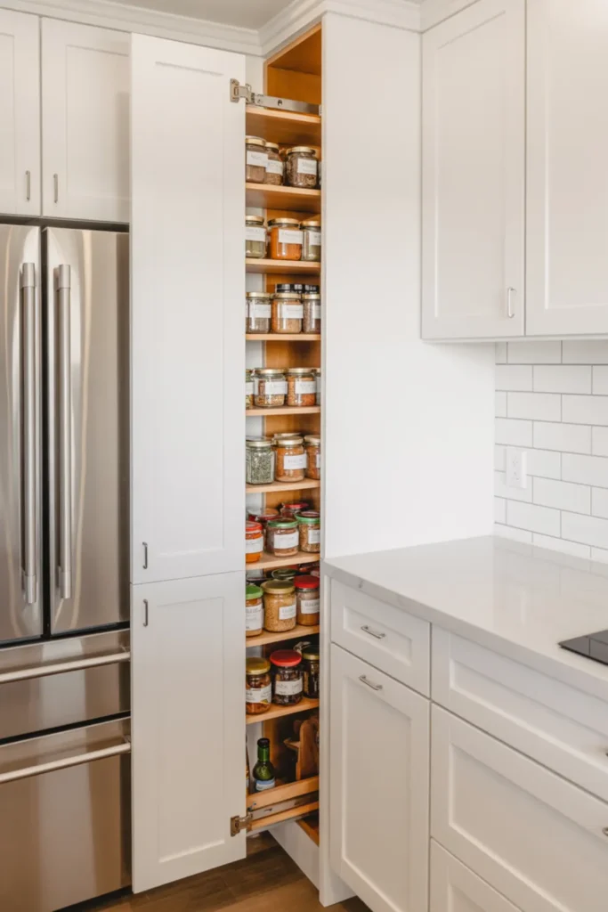 That tiny gap next to your fridge can become your sneaky best storage spot. Install a slim pull-out pantry and suddenly spices, oils, and snacks have a real home.