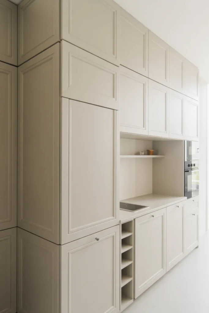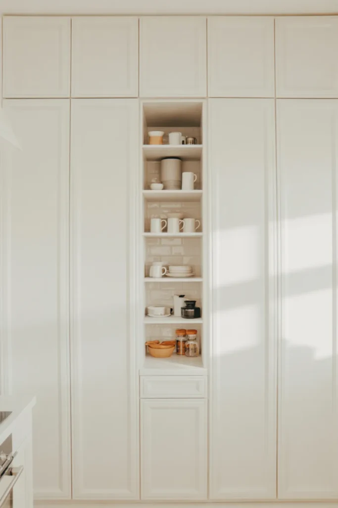 Picture a pantry wall that does the hard work while still looking pretty. Closed cabinets hide the messy stuff, and one open niche shows off your small white kitchenware in a clean way.