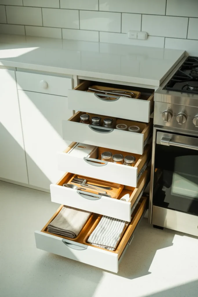 Dividers keep it from turning into a “junk drawer tower.” Place the stack near the stove or prep zone for a smoother cooking flow. The vertical shape also looks sleek next to white kitchen cabinets.