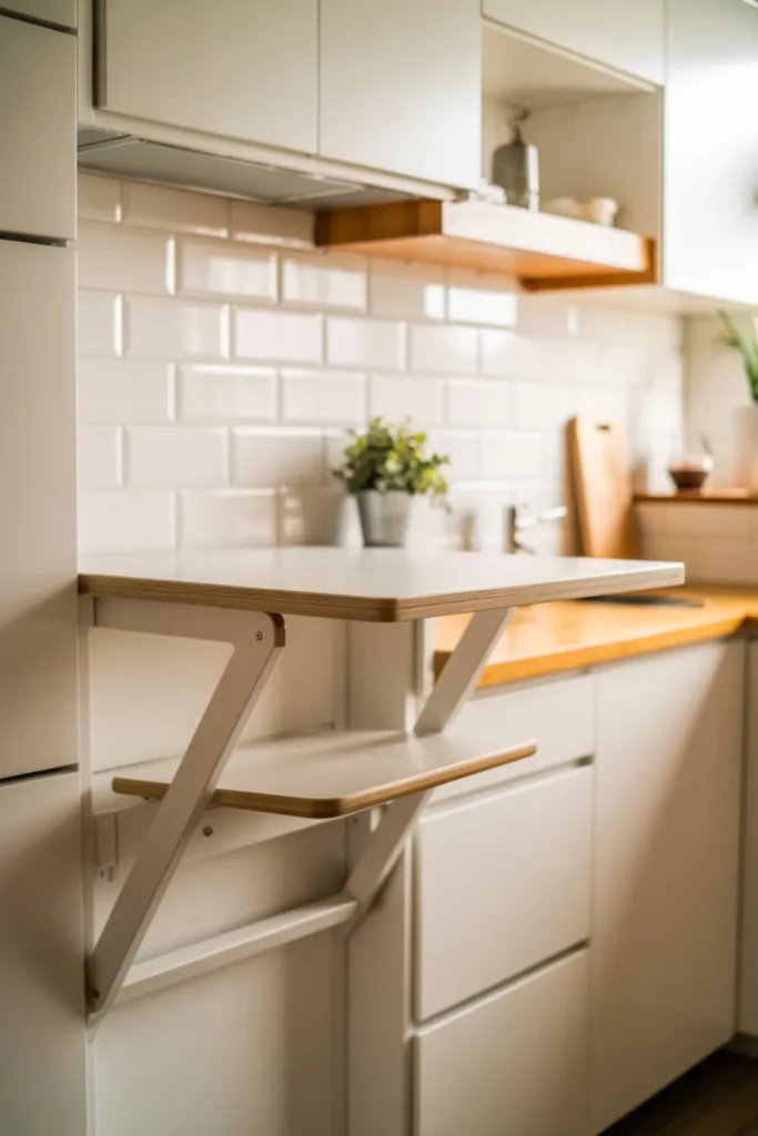 A fold-down table is a game-changer in tiny white kitchen ideas. You get a place to eat, chop, or work, then fold it up and reclaim your floor space.