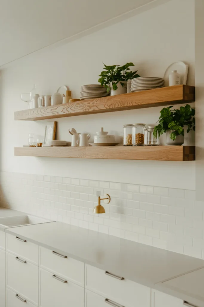 Open shelves can make a small white kitchen feel less boxed in. Swap one row of uppers for two slim shelves and you’ll instantly see more “air” around your white kitchen decor.