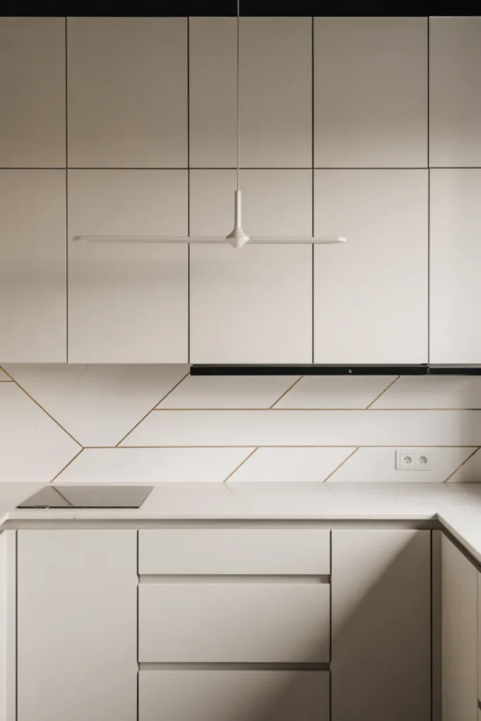 Texture keeps it interesting, so try a white-on-white geometric backsplash and a single statement pendant. Integrated or panel-ready appliances help the room feel bigger because nothing visually “jumps out.”