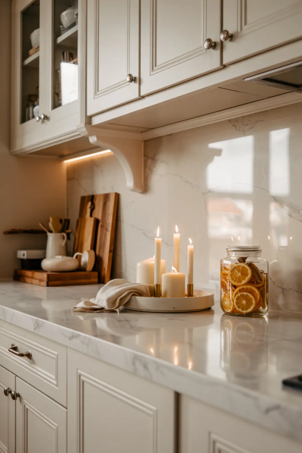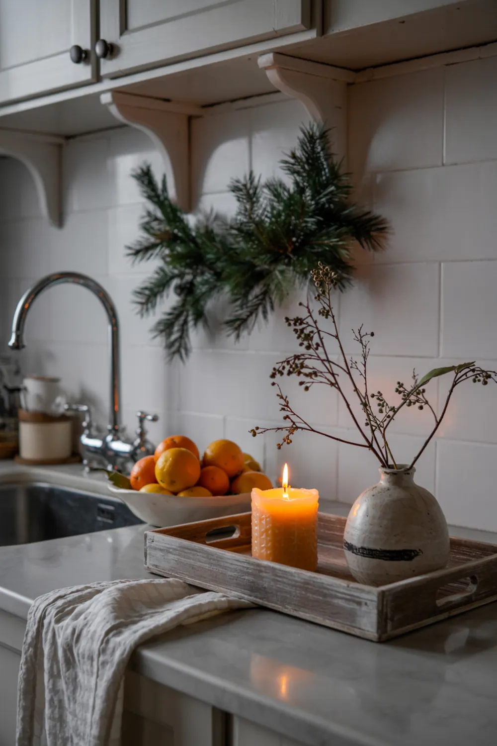 Add dried stems for height and a linen towel for that cozy kitchen feel. Youโ€™ll get a styled look that still leaves room for meal prep. Switch candle colors between ivory and warm gray for January decor after Christmas.