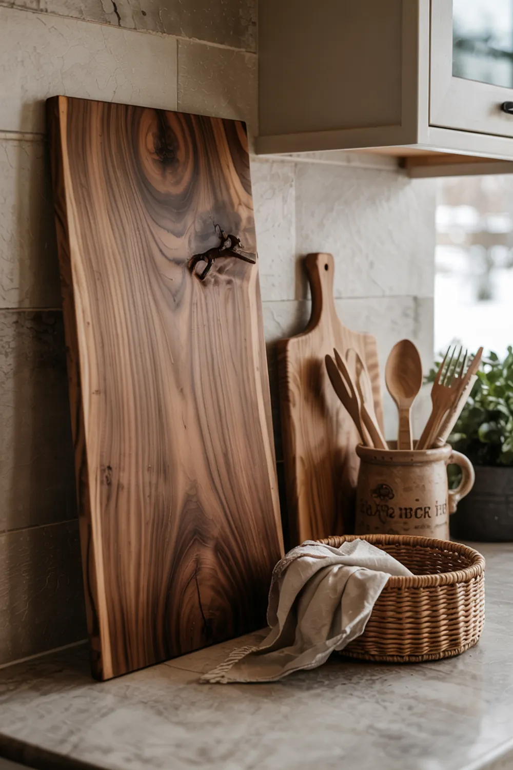 A live edge wood board adds instant warmth to an updated kitchen. Stand it upright behind your prep area and it becomes decor, even when youโ€™re not cooking. Pair it with a stoneware crock and a woven basket so the look feels rustic modern, not farmhouse-heavy.