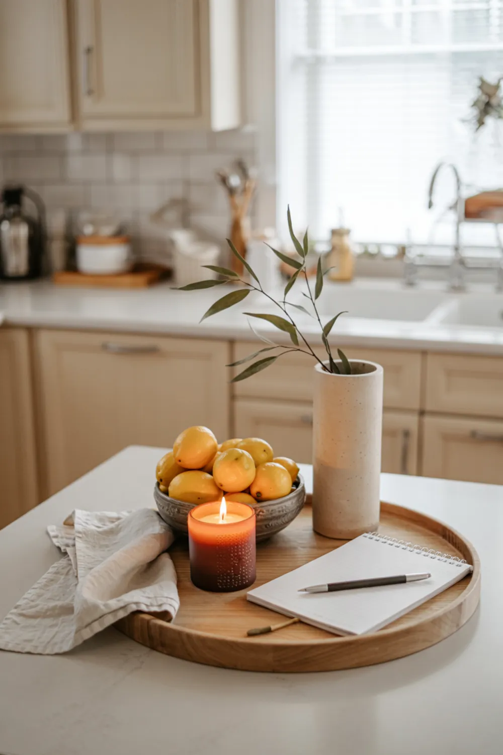 January is the time when you want your kitchen to feel calm again. Set up a small โ€œfresh startโ€ tray with lemons, an amber candle, and a notepad, and youโ€™ll instantly get that clean reset feeling.