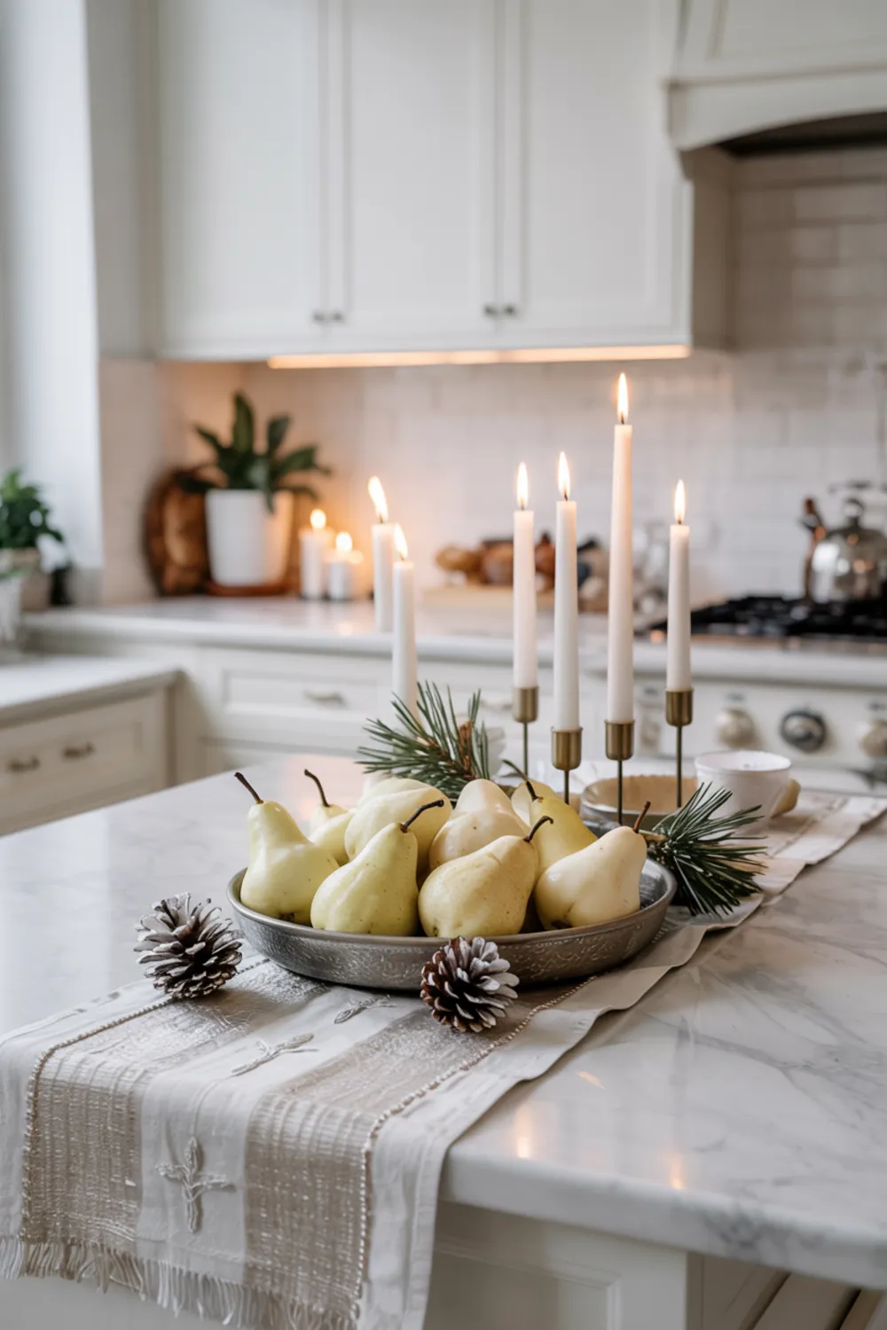 5. Winter Kitchen Counter Decor with Taper Candle Cluster