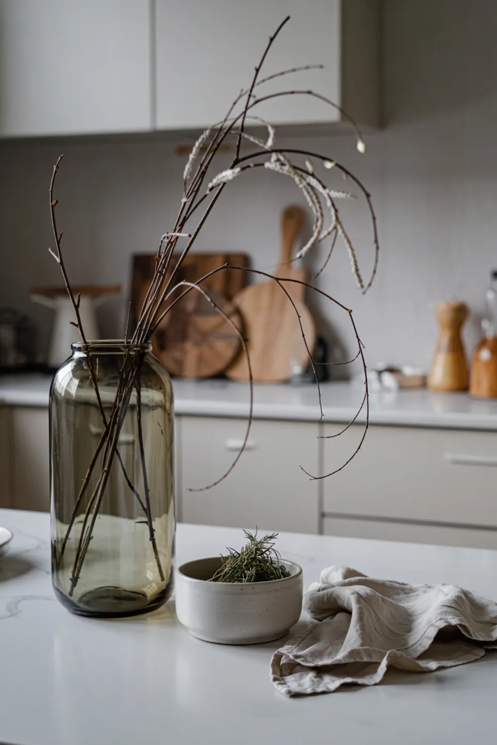 Keep the rest of the counter clear so your eye has a place to rest. This works especially well with Scandinavian style kitchens and neutral decor. Add one small bowl or towel nearby so it still feels like a real kitchen. If you want a softer vibe, choose branches with a gentle curve instead of sharp lines.