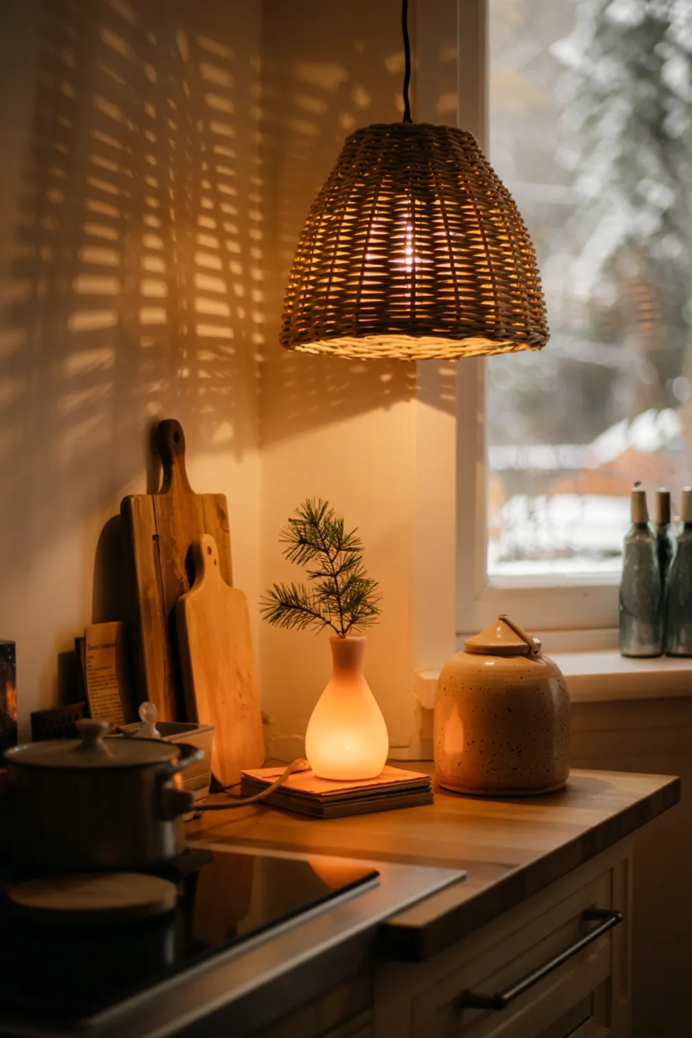 A kitchen can feel cold in winter even when itโ€™s clean. Warm patterned light from a wicker pendant fixes that fast. Style the corner under it with wood boards, a ceramic canister, and a tiny vase of greenery for simple winter decor that feels natural.