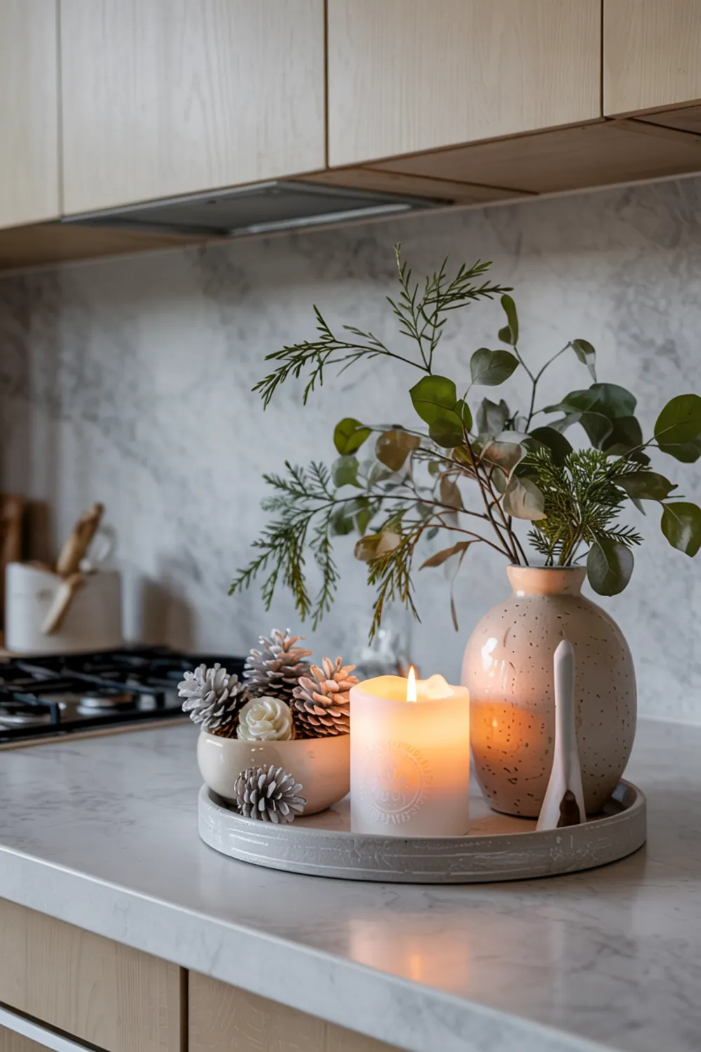 A frosted candle and a bowl of white pinecones give you winter decor without the Christmas look. Add eucalyptus for a clean, fresh feel. Youโ€™ll still get warmth, just in a calmer way. This is a quick win for decorating after Christmas, and it makes your kitchen feel more โ€œeverydayโ€ again.