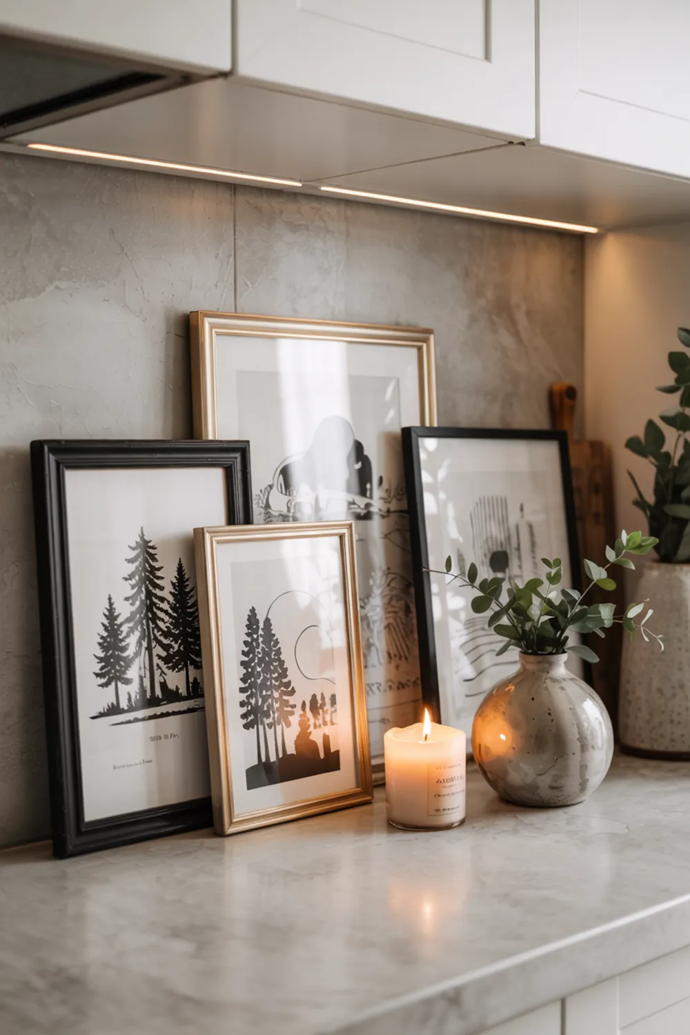 Black-and-white landscapes or simple pine line art work well with neutral decor. Soft under-cabinet lighting makes the frames glow at night. Keep the rest minimal with one candle and a small vase. You can rotate the prints each month, so January decor feels fresh without buying new stuff.