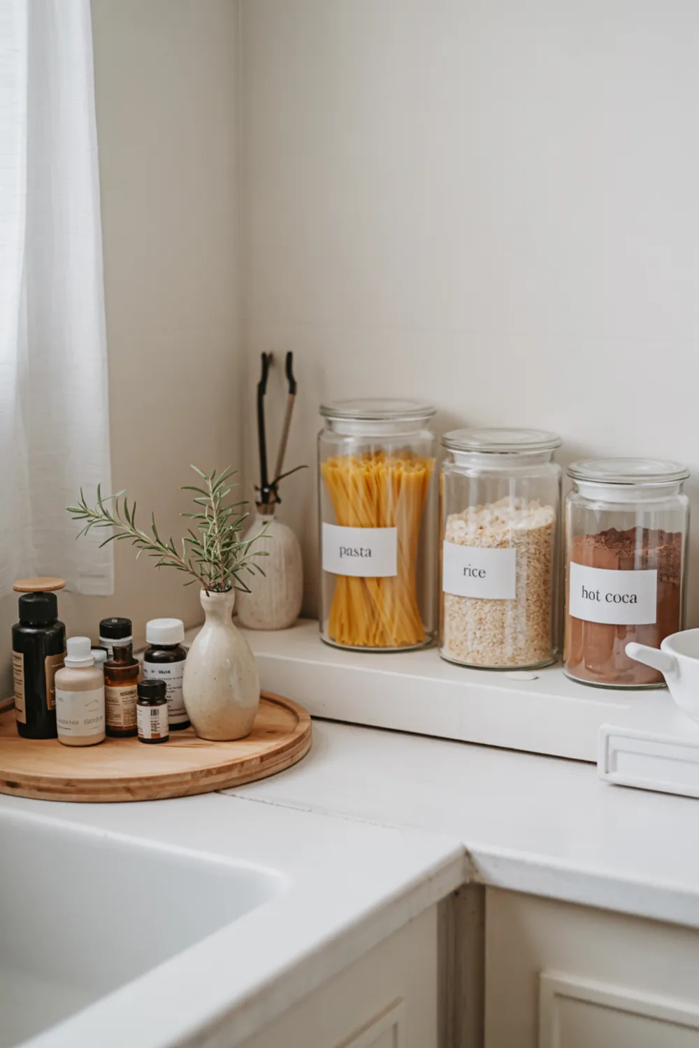 A messy counter makes your kitchen feel smaller, even in a big space. Use matching clear jars and simple labels to turn kitchen organization into decor. Hot cocoa mix, pasta, and rice look pretty when theyโ€™re stored neatly.