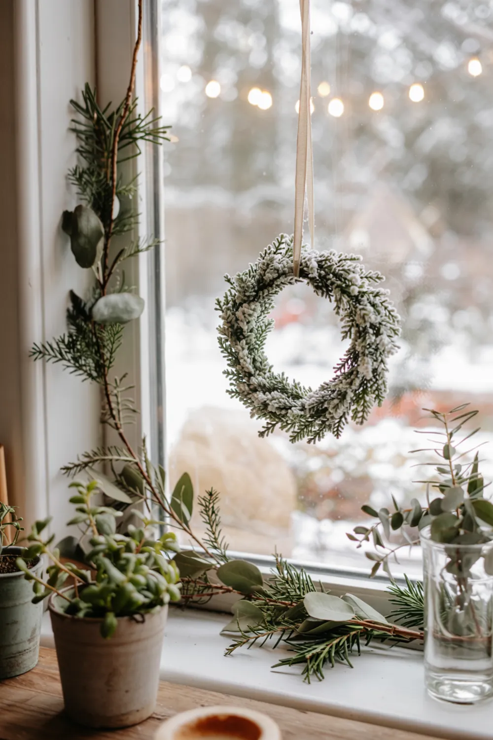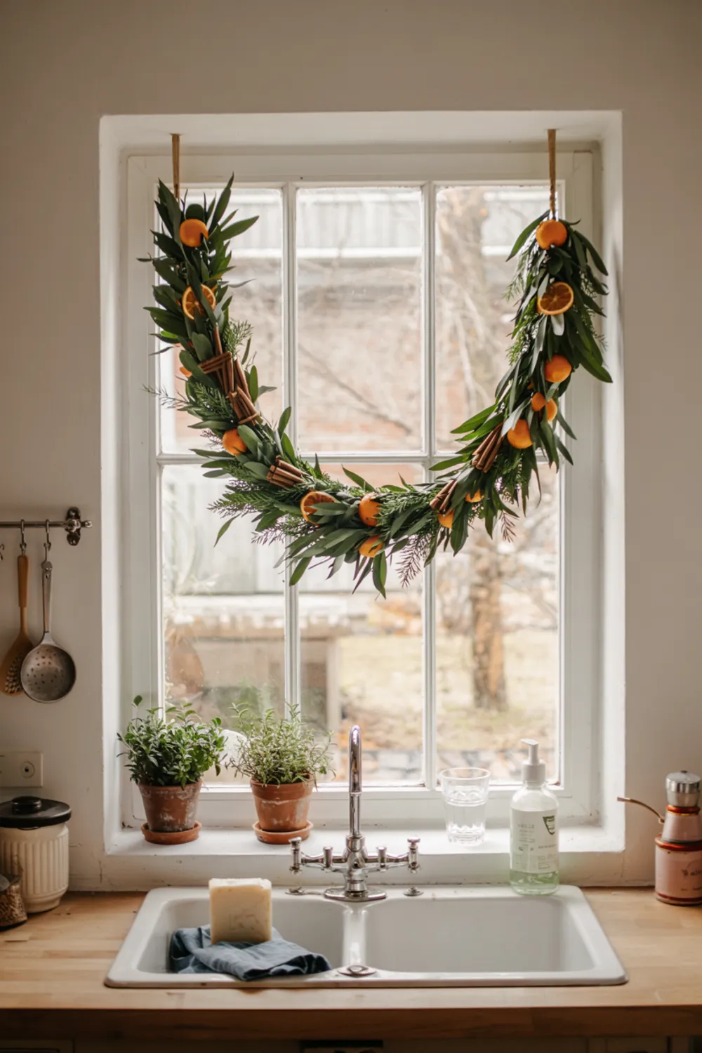 Use twine, eucalyptus, and dried oranges so it stays decor after Christmas, not holiday-heavy. Soft fairy lights tucked inside add a warm glow at night. Keep the window sill simple so it doesnโ€™t feel crowded. This works great in apartment kitchens because it adds impact without using counter space.