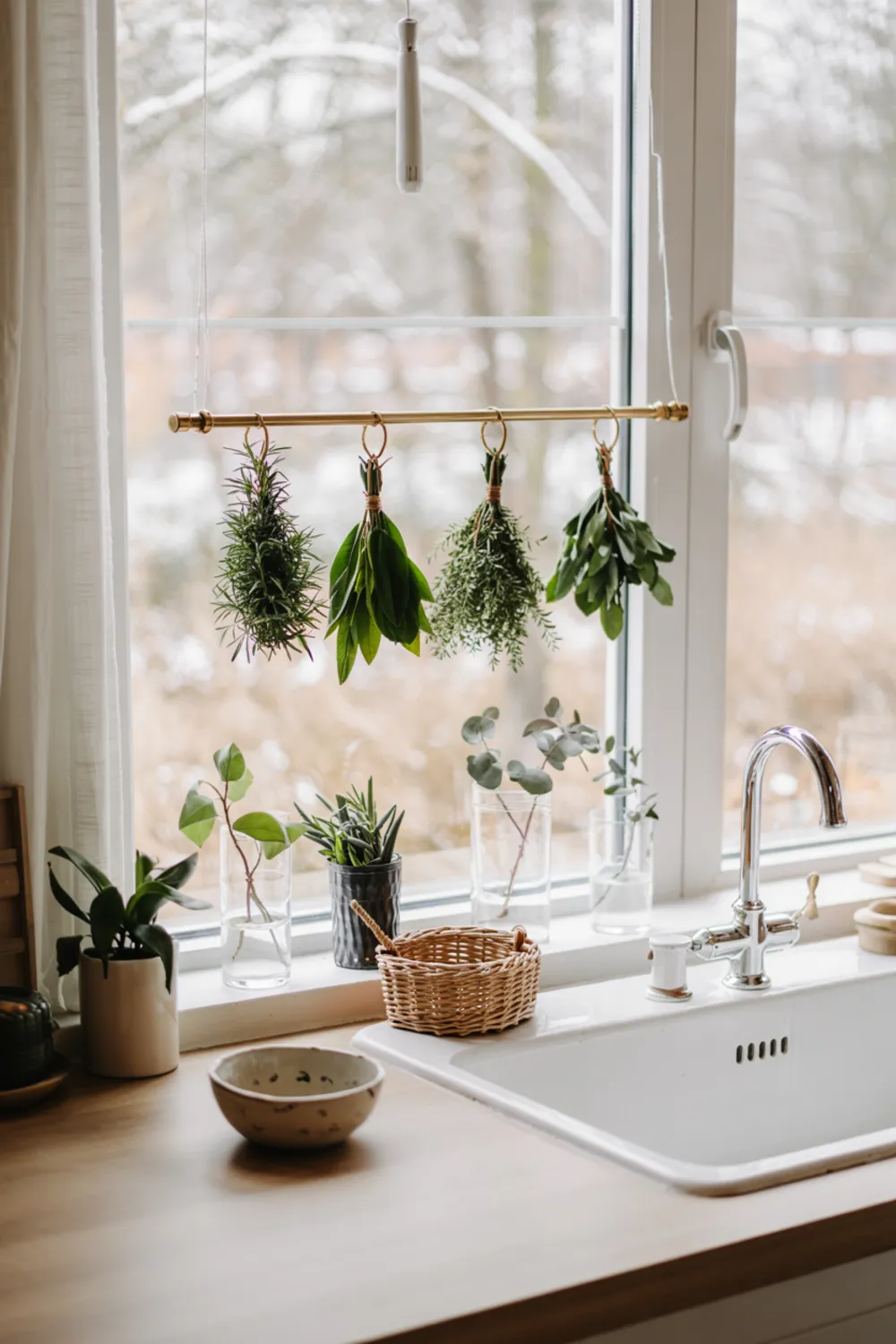 If your kitchen window looks a little bare in winter, make it a tiny focal point. Hang herbs like rosemary and sage from a slim rail and let them dry naturally. It adds scent, texture, and a lived-in winter kitchen vibe without cluttering your counter.