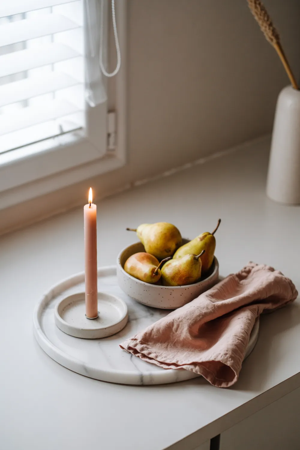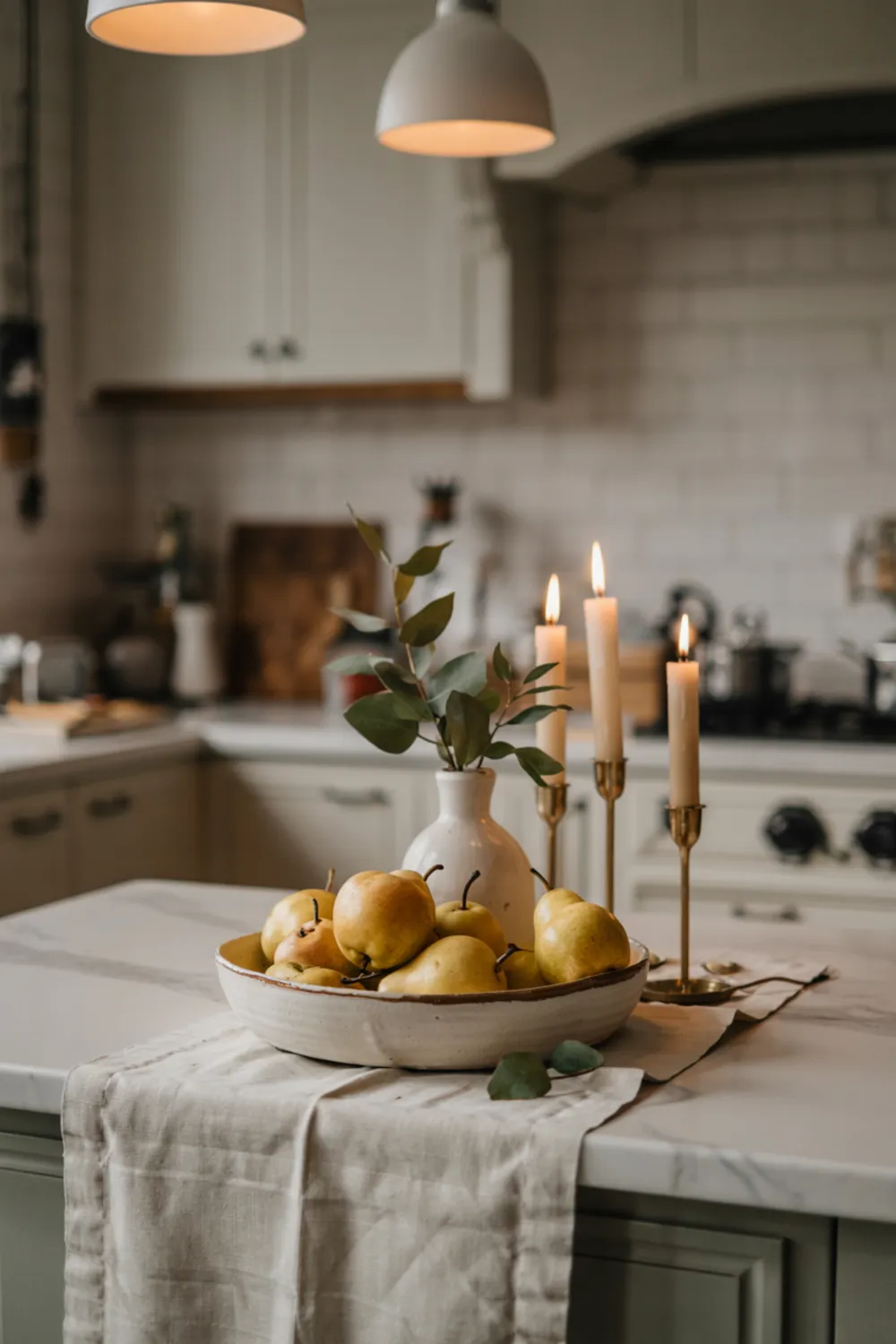 If your island feels like a giant empty slab, give it a small โ€œtableโ€ moment. Lay down a linen runner, then add a low bowl of pears and a couple of taper candles. The setup feels cozy, but you still have room to cook.
