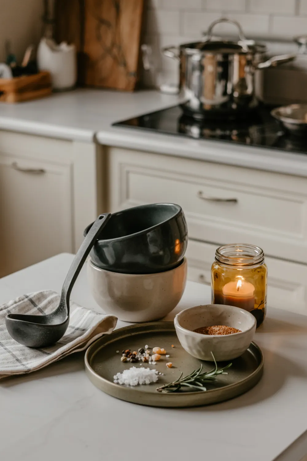 Cold nights make you want comfort food, so lean into it with a โ€œsoup nightโ€ setup that also looks like decor. Stack stoneware bowls, add a wooden ladle, and drape a linen towel nearby for instant cozy kitchen decor.