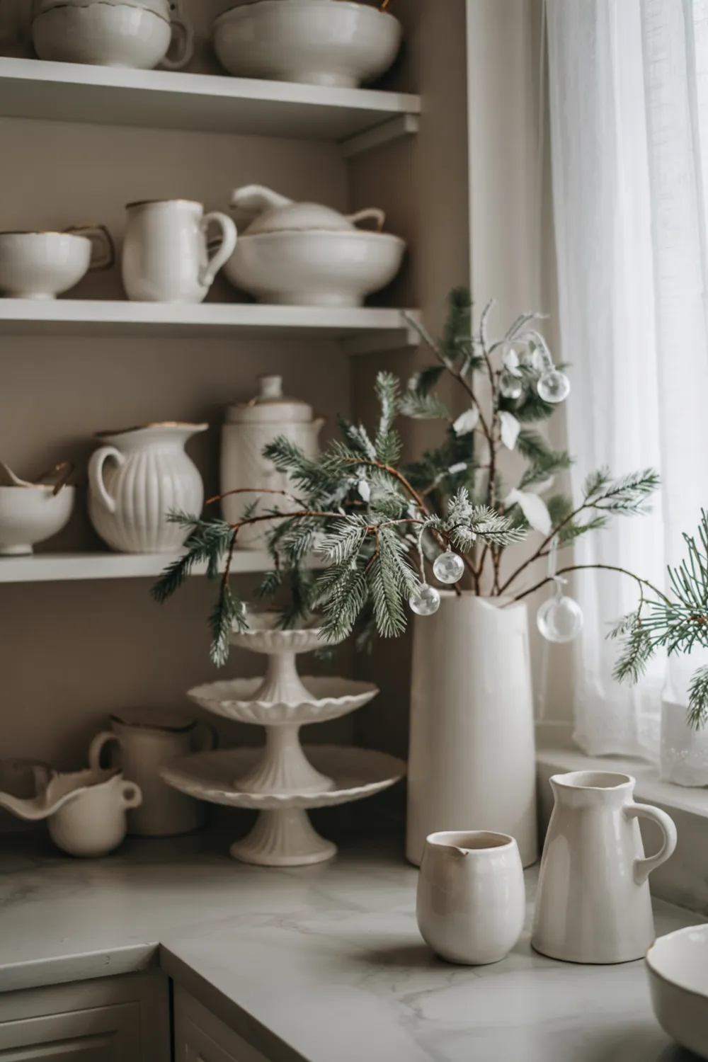 If you love a bright kitchen, a white-on-white winter look feels clean and calming. Style shelves with white ceramics, clear glass, and frosted pine branches for a winter wonderland vibe that still reads non Christmas winter decor.
