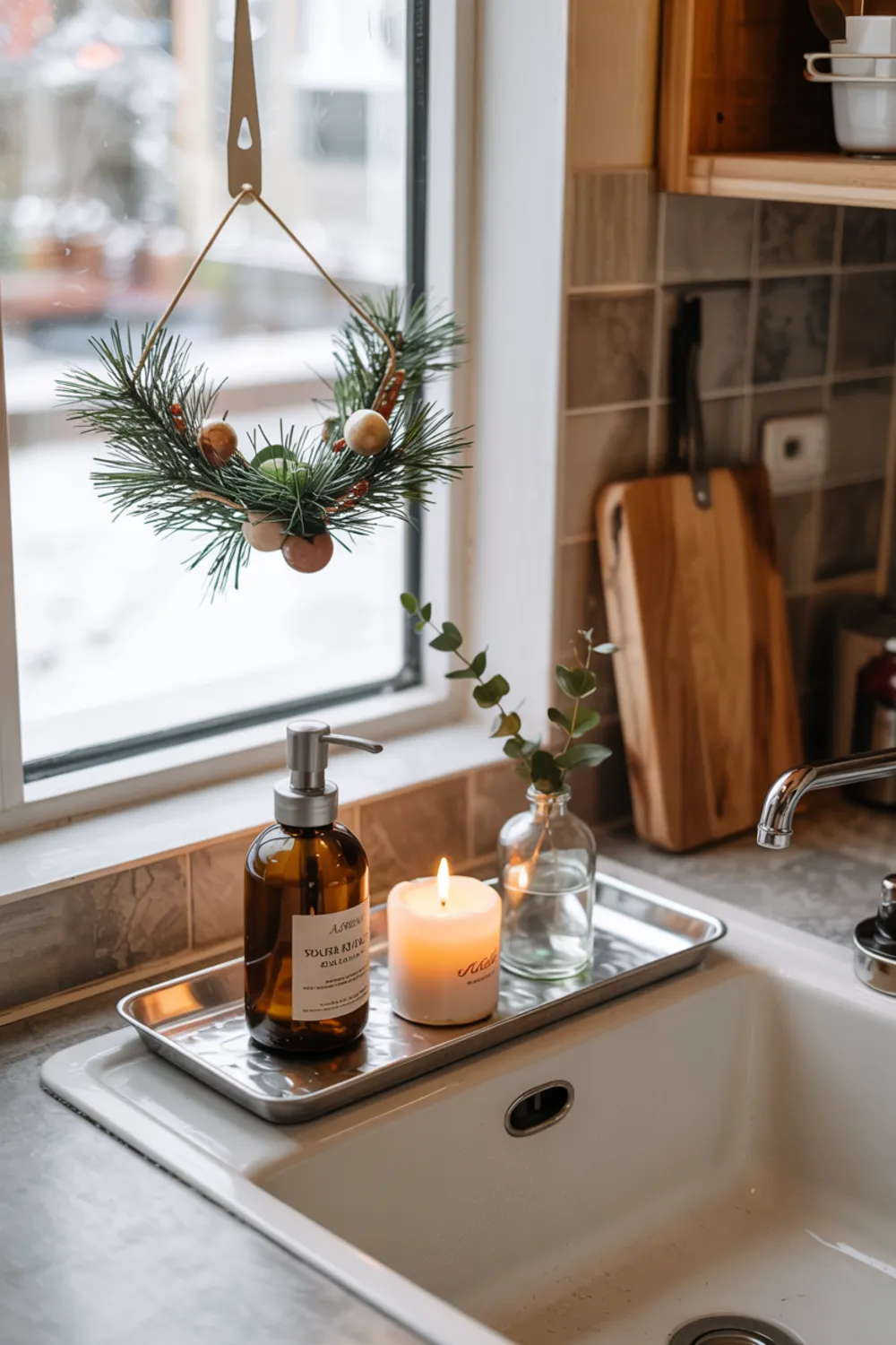 Small kitchens can feel chaotic fast, especially in winter when youโ€™re home more. Focus on one slim area near the sink and keep everything vertical. A mini tray with soap, a tiny candle, and a bud vase gives you winter kitchen decor without stealing prep space.
