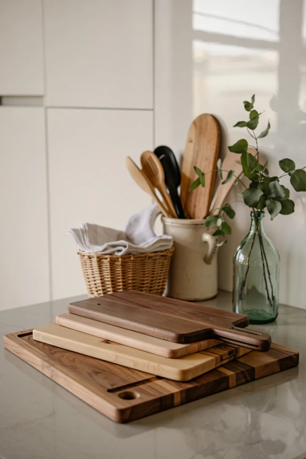 Keep shapes varied so it doesnโ€™t look flat. Gentle shadows are what make this style feel expensive, so leave a bit of open space between pieces. Youโ€™ll get a crisp, airy kitchen that photographs beautifully. For a warmer twist, add one natural wood board to break up the white.