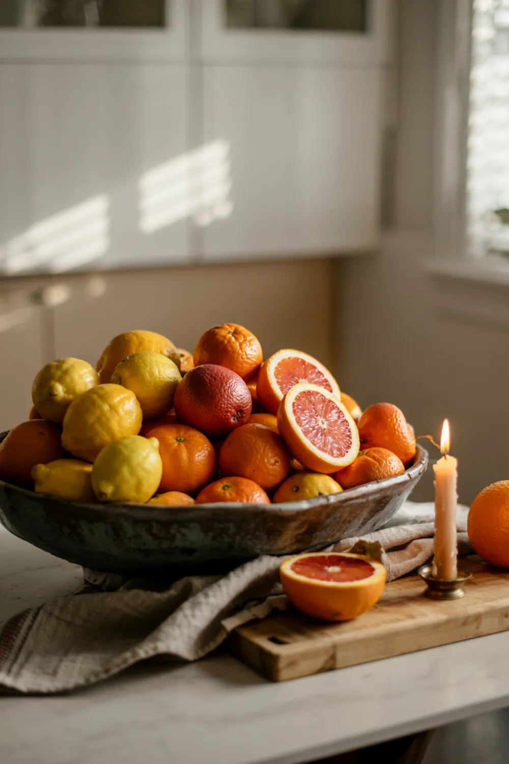 Winter kitchens can look dull when everything turns gray outside. Bring in season colors the easy way with a big citrus bowl. Lemons, blood oranges, and grapefruit look bold, smell great, and donโ€™t take up much space.
