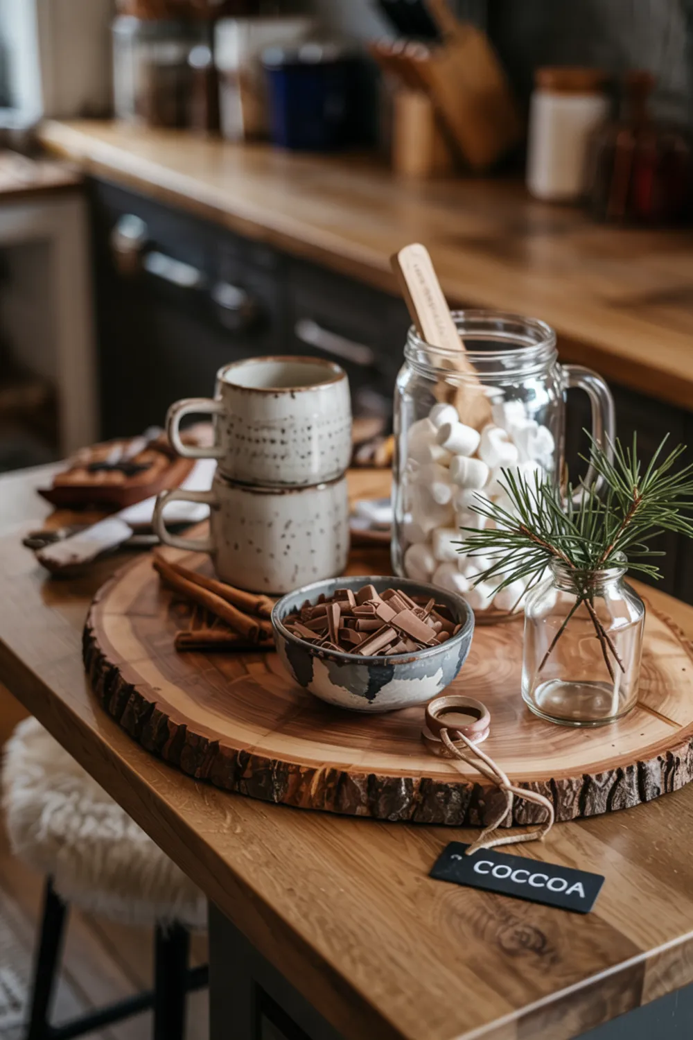 When your kitchen island feels plain, give it a fun winter kitchen decor moment that also works for real life. Set out stoneware mugs, cinnamon sticks, and a board with cocoa toppings so everything looks styled but usable.