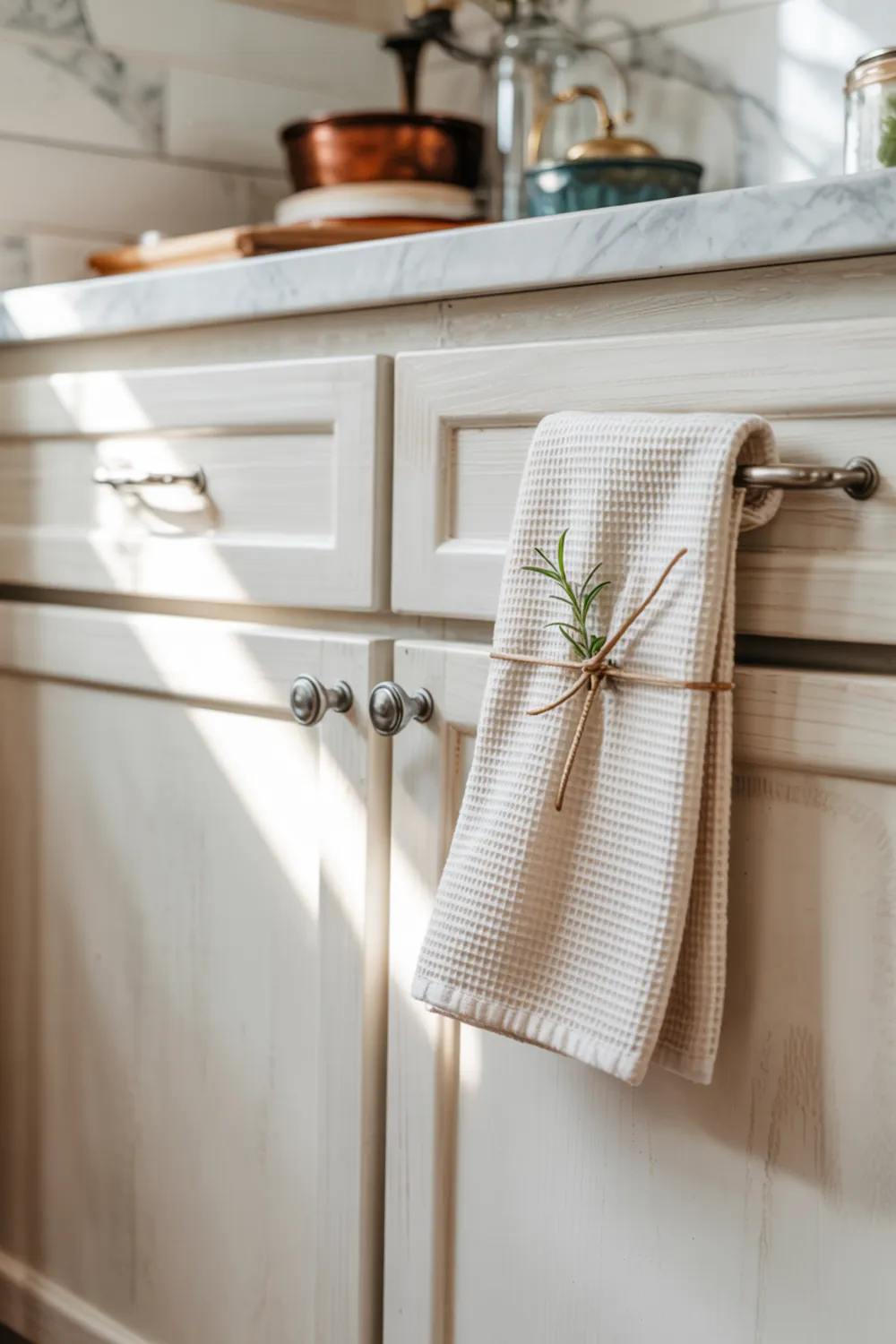 If your kitchen feels plain in winter, start with the easiest upgrade. Swap in thick waffle or linen towels in neutral decor tones and tie them with twine or a soft ribbon.