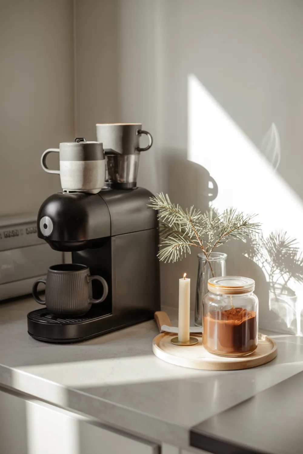 A coffee corner is one of the easiest spots to style because you already use it daily. Keep everything monochrome in black, white, and warm gray for a clean winter kitchen vibe.