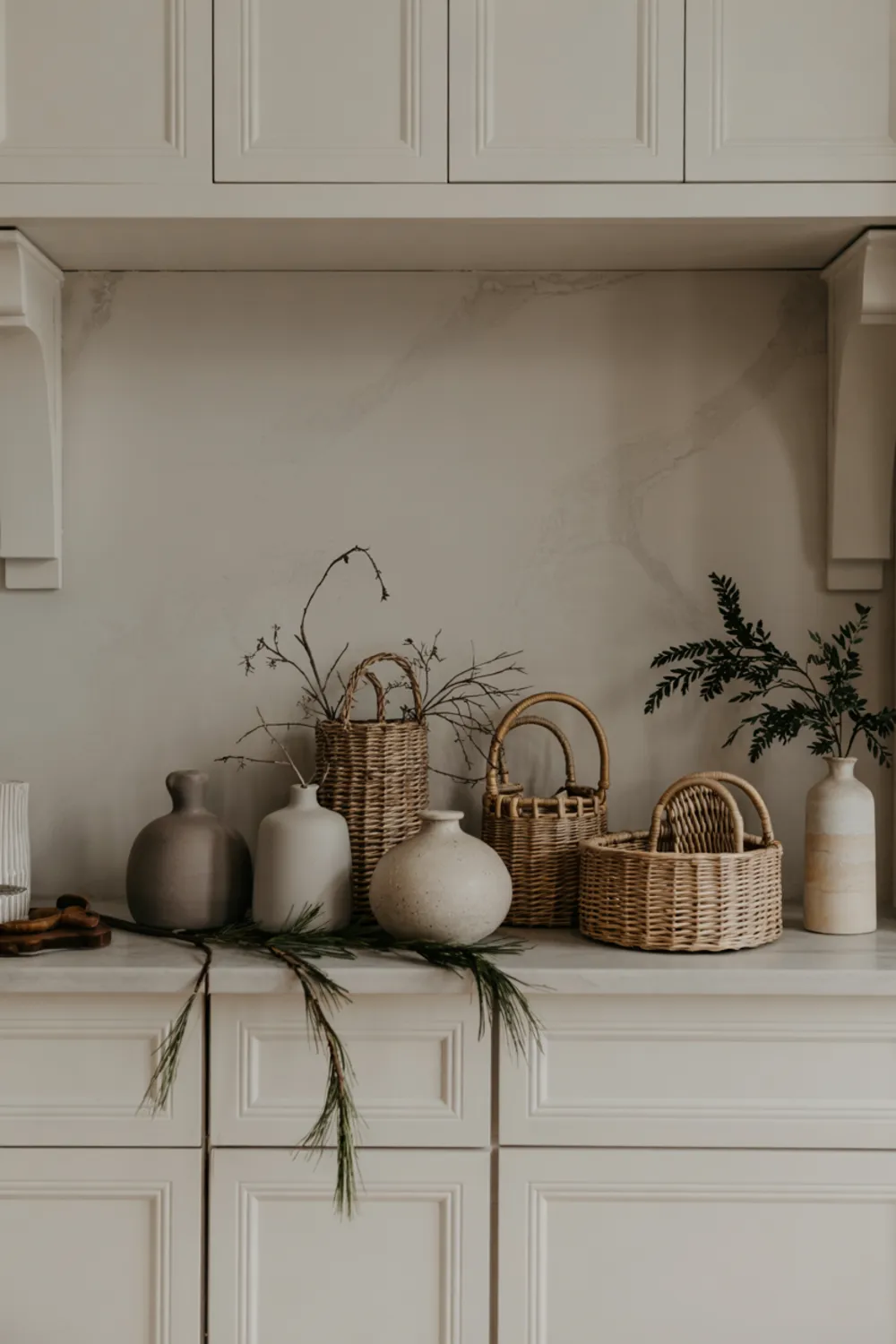 That empty space above your cabinets can look unfinished, especially after you take down holiday decor. Use mixed wicker baskets and matte ceramics to bring back balance in a simple winter decor way. The texture reads cozy without making the kitchen feel busy.