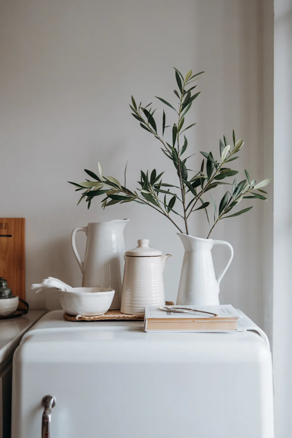 7. Top-of-Fridge Winter Styling with White Ceramics