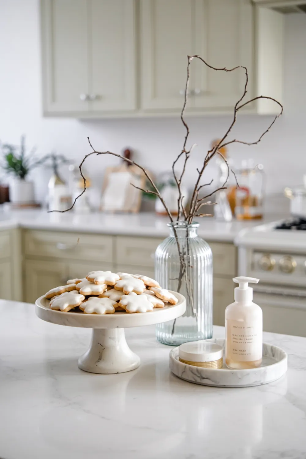 If your kitchen feels heavy in winter, cool tones can make it feel fresh and bright. Use icy blue-gray accents with marble or stone pieces to get that crisp โ€œice + stoneโ€ look. A small pedestal stand with white treats or simple pastries adds a playful touch without turning into holiday decor.